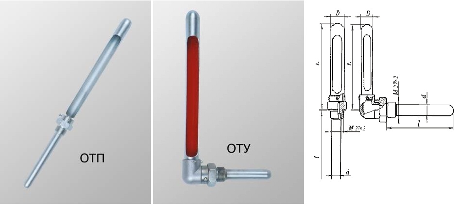 Верхняя часть оправ (чехол) имеет окно для шкалытермометра. Нижняя часть оправ (карман для погружаемой части термометра) сварная,состоящая из штуцера и цельнотянутой трубки.