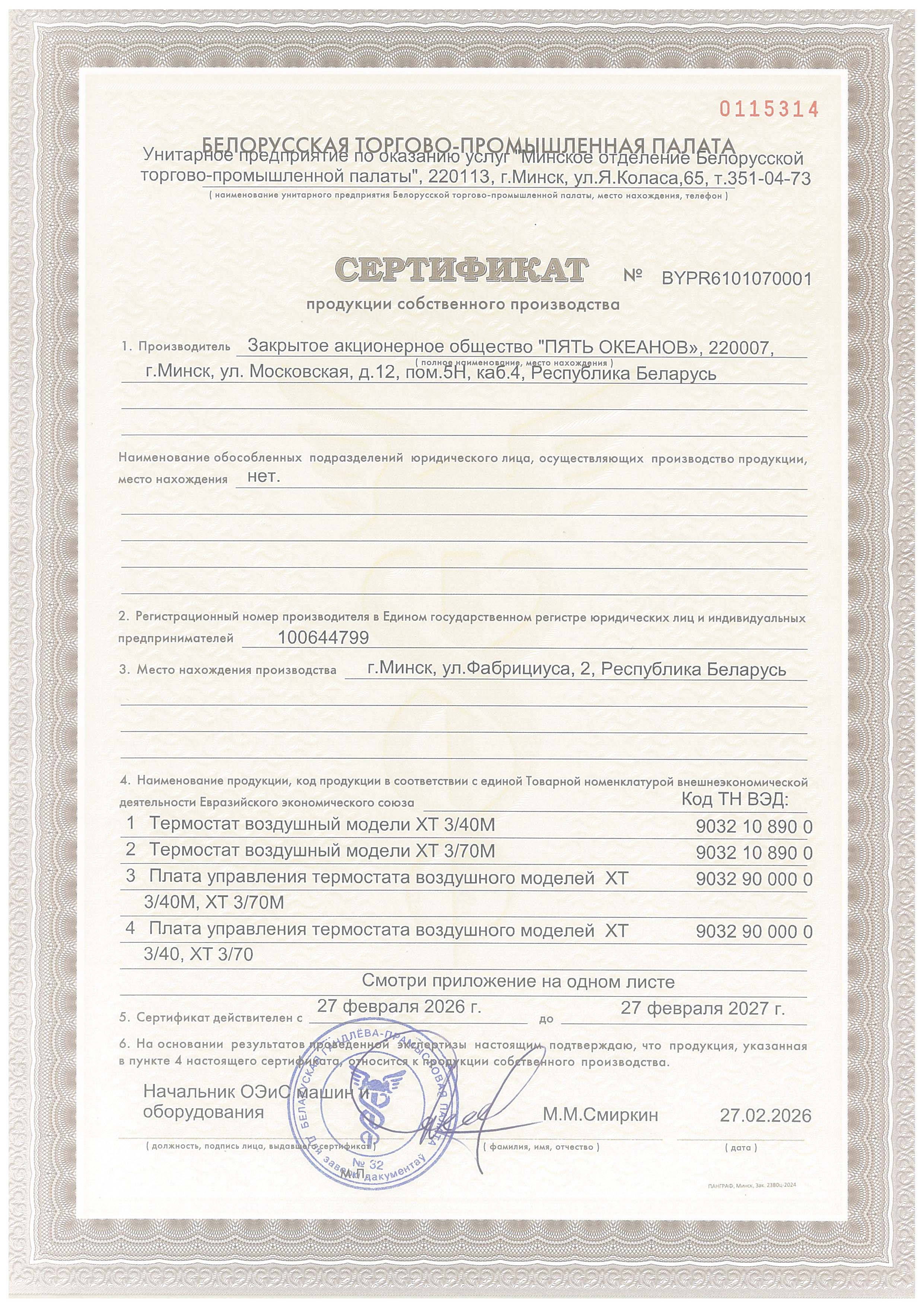 Рады сообщить, что мы обновили Сертификат продукции собственного производства Белорусской Торгово-промышленной палаты. Срок действия нового сертификата - до 27.02.2027 г.